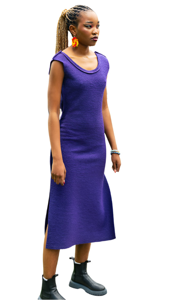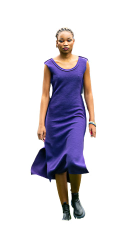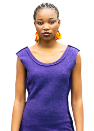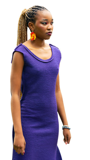 A pure cotton tweed Tunic dress in purple. A heavyweight fabric loosely woven in a textural yarn creating a soft yet granular fabric with slubs throughout. The DINI dress can be worn up or down. Featuring side slits